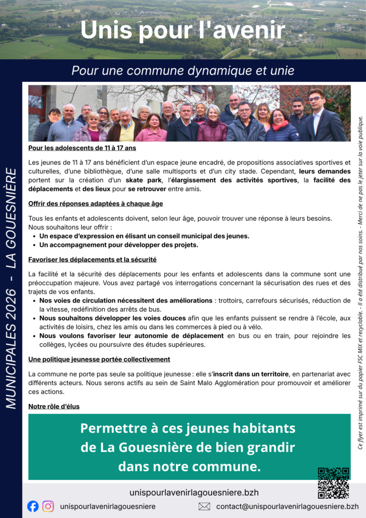 Ces échanges nourrissent notre réflexion pour une politique jeunesse adaptée à chaque âge. Parmi les sujets évoqués, la volonté de donner la parole aux jeunes à travers la mise en place d’un Conseil municipal des jeunes, doté d’un budget dédié, afin qu’ils puissent s’exprimer, proposer des projets et participer activement à la vie de la commune.